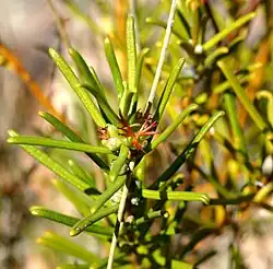 Bertya recurvata is a monoecious or dioecious shrub that has many branches and typically grows to a height of up to 1.5 m (4 ft 11 in). Its leaves are linear or strap-like, 15–27 mm (0.59–1.06 in) long and 1.5–2.6 mm (0.059–0.102 in) wide on a petiole 1.0–1.5 mm (0.039–0.059 in) long. The edges of the leaves are turned down or rolled under, the upper surface glabrous and green, and the lower surface white and densely covered with star-shaped hairs. The flowers are usually borne singly or sometimes in pairs in leaf axils on a peduncle up to 1 mm (0.039 in) long. There are three to eight narrowly egg-shaped or narrowly triangular outer bracts 2.7–3.5 mm (0.11–0.14 in) long and 1.0–2.6 mm (0.039–0.102 in) wide, the lower bracts slightly shorter. Male flowers are sessile with five oblong or elliptic sepal lobes 4.0–5.3 mm (0.16–0.21 in) long and 3.3–4.2 mm (0.13–0.17 in) wide and 40 to 80 stamens. Female flowers are also sessile, the five sepal lobes linear, 4.7–5.1 mm (0.19–0.20 in) long and have no petals. The ovary is oval to more or less spherical and glabrous, the style 0.5–0.8 mm (0.020–0.031 in) long with three spreading red limbs 4–6 mm (0.16–0.24 in) long, each with two to four lobes 3.0–4.5 mm (0.12–0.18 in) long. Flowering has been observed between July to October, and the fruit is an elliptic capsule, 7.5–8.2 mm (0.30–0.32 in) long and 3.5–5.1 mm (0.14–0.20 in) wide with one or two dark brown to reddish seeds with a creamy white elaiosome.[2]