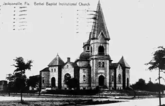 In 1861 the congregation built a permanent church structure in the west LaVilla neighborhood at Church and Julia streets.[1] Bethel Baptist was interracial until after the American Civil War and emancipation. Whites decided to segregate the congregation by race. At this time members were already facing a split over which pastor to follow, and white congregants tried to force the blacks, now freedmen, out of the church.[1] They took their case to court, but the court ruled in favor of the freedmen, who were the majority of the congregation, and ruled that they were the rightful owners of the Bethel Baptist name and property.[1] In this period across the South, many black Baptists were withdrawing from white-dominated churches to set up their own outside white control. They soon also established regional association and eventually a national organization.