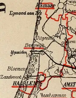 The electoral district of Beverwijk was created in 1888 out of parts of the Alkmaar and Haarlem districts, which were reduced from two seats to one. Fully located in the province of North Holland , it was centred on the city of Beverwijk and corresponded roughly to the Kennemerland region, running along the province's west coast, including the surroundings of Haarlem . Aside from Beverwijk, it included the municipalities of Akersloot , Assendelft , Bloemendaal , Castricum , Egmond aan Zee , Egmond-Binnen , Haarlemmerliede , Heemskerk , Krommenie , Limmen , Schoten , Spaarndam , Uitgeest , Velsen , Westzaan , Wijk aan Zee en Duin and Zandvoort . While it did not contain any large cities, it was a predominantly urban district.[ 1] [ 2]