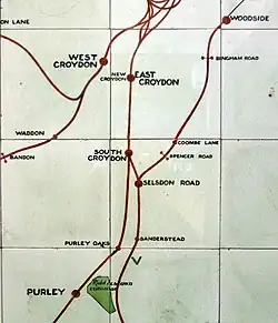 A 2-mile-29-chain (3.8 km) link between the Mid-Kent Line at Woodside and the Oxted Line at Selsdon Road known as the Woodside and South Croydon Joint Railway was authorised in 1880.[1] Opened on 10 August 1885, it was jointly worked by the London, Brighton and South Coast Railway and the South Eastern Railway.[1][2][3]