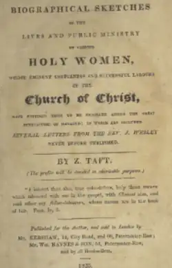 Biographical Sketches of the Lives and Public Ministry of Various Holy Women was written by Zechariah Taft and published in 1825–1828 in two volumes. The work was not supported by the Methodists and its publication costs were raised privately.[1] The books full title was Biographical sketches of the lives and public ministry of various holy women: whose eminent usefulness and successful labours in the church of Christ have entitled them to be enrolled among the great benefactors of mankind: in which are included several letters from the Rev. J. Wesley never before published" Any proceeds from the publication were to be donated to charity.
