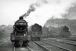 Common sights in the 1950s were WD Austerity 2-8-0s[7] and Stanier 'Crab's, with six of the latter usually at the shed at any one time.[8] Allocated shunters included Dock Tanks 47160,[nb 1] 47164 and 47166.[1]