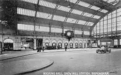It was never intended to be the main station, but the railway was prevented from reaching its original intended terminus at Curzon Street; London and North Western Railway's engineer Robert Stephenson and solicitor Samuel Carter argued in Parliament that there would be safety risks in rival companies sharing the congested connection into their station.[3] The original station was a simple temporary wooden structure, consisting of a large wooden shed covering the platforms. In 1871 it was rebuilt, and replaced with a permanent structure. The 1871 station had two through platforms, and bay platforms at the Wolverhampton end, covered by an arched roof.[4] Access to the station was from Livery Street from the side.[5] Trains from the south arrived through Snow Hill Tunnel, built by the cut-and-cover method, and in a cutting from Temple Row to Snow Hill. The cutting was roofed over in 1872 and the Great Western Arcade built on top.[2]