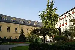 The Bishop's Palace in Kraków (Polish: Pałac Biskupi w Krakowie) is the seat of Kraków metropolitan Curia, Poland, and the traditional residence of Kraków bishops since the late 14th century. It is the second largest palace in the city after Wawel, the former seat of the Polish monarchs. It is part of a monastery complex of the Franciscan religious order. Bishop's Palace is best known for being the residence of Pope John Paul II during his stays in the city. He used to give his blessings and talk to his followers from a window above the main entrance at night.[1]