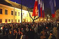 Following John Paul II's death on 2 April 2005, some 40,000 Catholics gathered before the palace for a night vigil and prayer (pictured).[6][8] On each anniversary of his death, thousands of flowers are placed around the building, and many fires are lit.[4] The window above the entrance is known as the "papal window," as John Paul II spoke to the crowds that gathered to see him from here.[4][5] In the courtyard stands a statue of John Paul II, sculpted and gifted to the palace by artist Jole Sensi Croci in May 1980.[6]