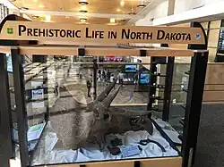 An exhibit on prehistoric life in North Dakota in the upper level of the terminal building, as seen in 2021; behind it on the lower level can be seen a baggage claim carousel and rental car company counters