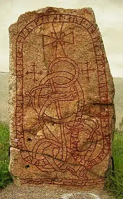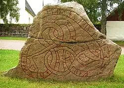 The Björklinge runestones are five Viking Age memorial runestones designated in the Rundata catalog as U 1045, U 1046, U 1047, U 1048, and U 1050 that are located at the church in Björklinge, Uppsala County, Sweden, which is in the historic province of Uppland. In addition, there is a small fragment of a runestone with a partial runic text i * lit * rita * meaning "had erected" that has been given the catalog number U 1049.[1]