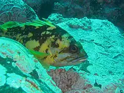 Sebastes chrysomelas, commonly known as the black-and-yellow rockfish, is a marine fish species of the family Sebastidae. It is found in rocky areas in the Pacific off California and Baja California. Although it is similar in appearance to the China rockfish, the black-and-yellow rockfish lacks the China's long yellow streak. The China rockfish has a continuous yellow band while the black-and-yellow rockfish only has scattered patches of yellow across its body.[2]