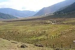 The conservation area or habitat in the Phobhjikha Valley, established in 2003 has, not only the black-necked cranes, but also 13 other vulnerable species such as rufous-necked hornbill Aceros nipalensis, chestnut-breasted partridge Arborophila mandellii, Pallas's fish eagle Haliaeetus leucoryphus, nuthatch Sitta Formosa, wood snipe Gallinago nemoricola, Blyth's tragopan Tragopan blythii, greater spotted eagle Clanga clanga, imperial eagle Aquila heliaca, Baer's pochard Aythya baeri, Hodgson's bushchat Saxicola insignis, dark-rumped swift Apus acuticauda, and grey-crowned prinia Prinia cinereocapilla.[1] The black-necked cranes arrive in this valley in late October and depart in mid February.[8] They feed on the particular type of dwarf bamboos that grow in the wetlands of the valley. The thick grasslands of wetlands are also grazing grounds for a large number of cattle and horses during the summer months that helps the growth of the tender bamboo shoots on which the cranes feed later during the winter season. There were suggestions that the wetlands be drained and used to grow cash crops such as potatoes, which is also the main crop of the valley. Such an action would have deprived the cranes of their main feeding centres.[9] However, Palje "Benjie" Dorji, former Chief Justice of Bhutan, former Minister for Environment and uncle of the present King of Bhutan, as the Chairman of the Royal Bhutan Society and as founder of the Black-necked Conservation Programme prevailed on the Government of Bhutan to drop the proposal to drain the wetlands of the Phobjika Valley to create farms to grow cash rich seed potatoes.[3][10]