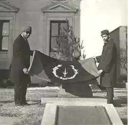 The inspiration for the flag came from Melvin Charles and Gleason Jackson bouncing ideas off of each other and going to the library for extra inspiration for the flag's design and symbolism.[5] The flag is said to have received some opposition from some people, but was eventually accepted and supported by the mayor, and was officially hoisted onto a flagpole at the city hall in Newark, New Jersey, on March 5, 1967.[6][4] In December 1967, Charles and Jackson received acknowledgement of the flag from President Lyndon B. Johnson. The letter was signed by the Personal Secretary to the President of the United States.[3] The Black church did not accept the flag as much, but most of Charles and Gleason's success came from contacting municipalities to showcase and spread the knowledge of the flag's existence.[7]