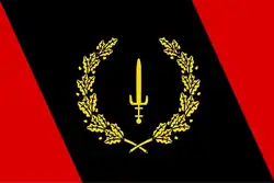 | Design | One diagonal black stripe centered between two red stripes. Superimposed on the black stripe is a blunted sword surrounded by a golden wreath of fig leaves. |