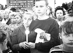 Lithuanians protesting against the Soviet occupation in Panevėžys during the Baltic Way on Black Ribbon Day in 1989