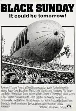 Black Sunday is a 1977 American action thriller film directed by John Frankenheimer and based on Thomas Harris's novel of the same name. It was produced by Robert Evans, and stars Robert Shaw, Bruce Dern and Marthe Keller. It was nominated for the Edgar Allan Poe Award in 1978.[3] The screenplay was written by Ernest Lehman, Kenneth Ross and Ivan Moffat. Ross had previously written the screenplay for The Day of the Jackal, a similar plot-driven political thriller. The inspiration of the story came from the Munich massacre, perpetrated by the Black September organization against Israeli athletes at the 1972 Summer Olympics, giving the title for the novel and film.[4]
