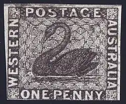The Black Swan is the first postage stamp issued by the British colony of Western Australia in 1854. It illustrates a black swan, a typical Australian animal at the time and was the only image used on Western Australian stamps until 1902.[1]