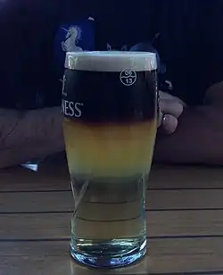A black velvet can also be made by filling a champagne flute halfway with sparkling wine and floating the chilled stout beer on top of the wine.[5] The differing densities of the liquids cause them to remain largely in separate layers (as in a pousse-café).[5] The effect is best achieved by pouring the stout over a spoon turned upside down over the top of the glass.[5][6]