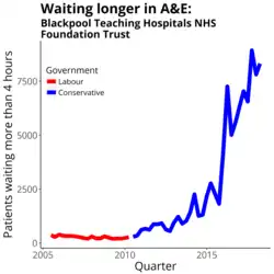 In February 2016 the trust had the worst performance in England against the four-hour target in emergency departments with a performance of 63% against the target of 95%.[7] Its handover times from paramedics to casualty staff were also very poor, with a designated "corridor nurse" employed to manage patients for whom there was no bed available.[8] In March 2018 it was still the worst performer in England, with only 48.3% of patients in the main A&E seen within 4 hours, and 62 waiting more than 12 hours from the decision to admit to actual admission to a ward.[9] In December 2019 it was the second worst performing trust in England, with only 44.2% seen within 4 hours.[10]