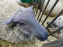 The Bleu du Maine is a large heavy sheep: rams weigh some 110–120 kg, ewes about 80–90 kg.[3]: 765 It is characterised by a distinctive blue face, varying in colour from almost black to a reddish tinge. The fleece is white. The face is broad, with a slightly convex profile; it and the legs are free of wool.[3]: 765