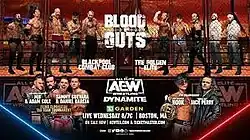 Blood & Guts featured professional wrestling matches that involved different wrestlers from pre-existing scripted feuds and storylines. Wrestlers portrayed heroes, villains, or less distinguishable characters in scripted events that built tension and culminated in a wrestling match or series of matches.[5] Storylines were produced on AEW's weekly television programs, Dynamite, Collision, and Rampage.