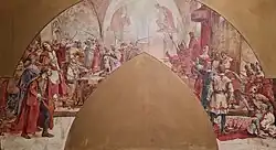 After the disastrous Battle of Nicopolis, King Sigismund called for a meeting of the Sabor in the city of Križevci and issued a written guarantee (saluus conductus) stating he would not attempt personal revenge on his opponents or harm them in any way.[1] He betrayed this promise, however, and secretly organised the murder of the Croatian Ban Stephen II Lackfi (Stjepan Lacković) and his followers for supporting the opponent king candidate Ladislaus of Naples. The Croatian law dictated that no one could enter the Sabor with arms, so Ban Lackfi and his supporters left their arms in front of the church. Lackfi's supporting troops also remained outside the town. The king's supporters, on the other hand, were already in the church, fully armed.[2] In the turbulent debate that followed, the king's supporters accused Lackfi of treason in the Battle of Nicopolis. Harsh words were used, a fight started, and the king's vassals pulled their swords in front of the king, killing Lackfi, his nephew Stephen III Lackfi, who formerly served as Hungary's Master of the Horse, and the supporting nobility.