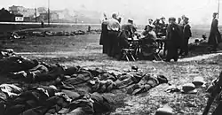 The Bloody Wednesday Olkusz 1940. German soldier guarding prone men of Olkusz on July 31. The picture has been described as "known to everyone in Olkusz".[9]: 212