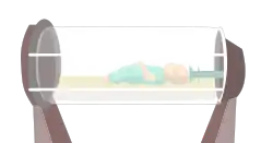 Bloxsom developed the air lock device based on his assumptions about the role of uterine contractions in establishing effective breathing at birth. The air lock was a sealed steel cylinder that delivered warmed and humidified 60% oxygen to newly born babies. The device has been compared to an iron lung, but it did not utilize negative pressure.[2][3] The pressure inside the chamber alternated between 0.07 and 0.2 atmospheres above sea level. Rather than alternating the pressures at the rate of normal respirations as other devices did, the Bloxsom air lock cycled the pressure once per minute to mimic the rate of uterine contractions in late labor.[4] Babies in distress were placed in the chamber immediately after delivery.[3]