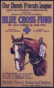In 1912, the League launched the Blue Cross Fund to care for horses during the Balkan War.[b] On the outbreak of the First World War in 1914, it was quickly reopened again. By the armistice in 1918, the Blue Cross Fund had raised nearly £170,000 – the equivalent of almost £6.5 million today – to care for the animals of conflict. Over 50,000 horses were treated in Blue Cross hospitals in France, and the charity had sent vital veterinary supplies to 3,500 units of the British Army.[15] The president of the Blue Cross Fund was Olive Smith-Dorrien.[16] Chairmen of the Blue Cross Fund included Charles Forward in 1914 and Sir Ernest Flower from 1915 to 1919.[17][18][19]