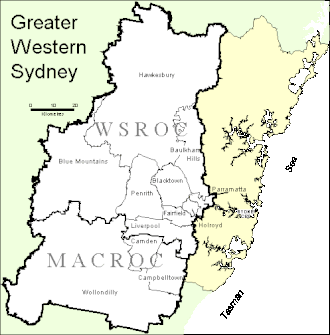 The Blue Mountains (Gundungurra/Dharug: Colomatta or Gulumada)[4][5] are a mountainous region and a mountain range located in New South Wales, Australia. The region is considered to be part of the western outskirts of the Greater Sydney area. The region borders on Sydney's main metropolitan area, its foothills starting about 50 kilometres (31 mi) west of centre of the state capital, close to Penrith.[6] The public's understanding of the extent of the Blue Mountains is varied, as it forms only part of an extensive mountainous area associated with the Great Dividing Range.[7] As defined in 1970, the Blue Mountains region is bounded by the Nepean and Hawkesbury rivers in the east, the Coxs River and Lake Burragorang to the west and south, and the Wolgan and Colo rivers to the north.[8] Geologically, it is situated in the central parts of the Sydney Basin.[9]