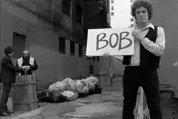 The music video references the recording of Dylan's song "Subterranean Homesick Blues" in the 1967 D. A. Pennebaker documentary Dont Look Back.[3] The video for "Bob" is similarly shot in black-and-white, and in the same back-alley setting, with Yankovic dressing as Dylan and dropping cue cards that have the song's lyrics on them, as Dylan did in the film.[3][4][11] The video features cameo appearances by Yankovic's drummer Jon "Bermuda" Schwartz and frequent Yankovic video director Jay Levey, standing in the same positions as Allen Ginsberg and Bob Neuwirth in the Dylan video.