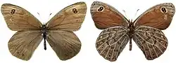"The nomotypical parmenio Boeb. (35 d) occurs in the mountains of Siberia, especially in the Altai and Amurland, as well as in Mongolia and Manchuria. The ground-colour of the hindwing above is somewhat lighter than in [Erebia] afer; the costal margin and sometimes the apex being dusted with grey. The band of the forewing consists of 4 rounded russet-yellow spots with black white-centred spots. The 2 upper ones are confluent, forming a large black spot which bears 2 white dots. The hindwing has 3—4, more rarely 5, russet -yellow spots with black white-centred ocelli. The forewing red-brown beneath, the costal margin, apex, and a portion of the distal margin dusted with silvery grey, the double ocellus narrowly ringed with yellow. The other ocelli are very small, being often partly or all absent. The underside of the hindwing grey-brown, finely dusted with white-grey, especially towards the base. All the veins are shaded with grey and contrast strongly with the ground-colour. The distally dentate median band is bordered by a band-like silver-grey arched line. The distal margin is edged with a grey line, and proximally to this there is a narrow dentate brown band which is divided by the veins. The submarginal ocelli encircled with pale yellow. The female differs above but little from the male; the grey dusting at the apex of the forewing extends in many specimens to near the cell, especially on the underside, where the veins are also silvery. The butterflies flutter on dry and stony places slowly and low above the boulders, the forewing being moved in a different plane as the hindwing; Elwes, who saw all forms of parmenio alive, did not find this kind of flight in any other butterfly. On the wing in July, settling on grass. The species occurs in large numbers in its flight-places, whole swarms rising from before the feet of the observer.[1]