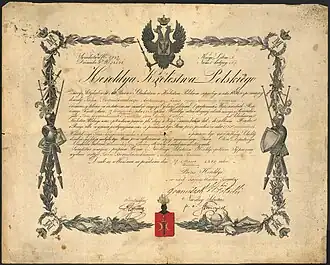 Nobility card issued in 1849 by the Heroldia of the Kingdom of Poland to Antoni Jan Bogusławski, co-owner of Korczewo