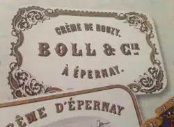 Boll & Cie is a Champagne house based in Reims, a producer of sparkling wines from the Champagne region of France, founded in 1853. With the exception of the Brut Rose, all Champagnes from Boll & Cie are blanc de blancs. Boll & Cie specializes in Brut Champagne, including a Grand Cru from the village of Le Mesnil-sur-Oger.[1]