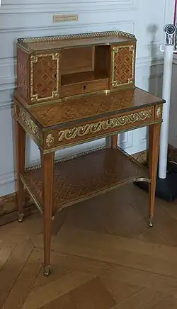 A bonheur du jour (in French, bonheur-du-jour, meaning "daytime delight") is a type of lady's writing desk. It was introduced in Paris by one of the interior decorators and purveyors of fashionable novelties called marchands-merciers about 1760, and speedily became intensely fashionable.[1] The bonheur du jour is always very light and graceful,[2] with a decorated back, since it often did not stand against the wall (meuble meublant) but was moved about the room (meuble volant); its special characteristic is a raised back, which may form a little cabinet or a nest of drawers, or open shelves, which might be closed with a tambour, or may simply be fitted with a mirror. The top, often surrounded with a chased and gilded bronze gallery, serves for placing small ornaments. Beneath the writing surface there is usually a single drawer,[2] often neatly fitted for toiletries or writing supplies. Early examples were raised on slender cabriole legs; under the influence of neoclassicism, examples made after about 1775 had straight, tapering legs.