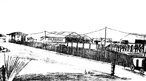 The station was a small one, with only a single pair of tracks, and had no platforms. The station had wooden buildings, and those from the earliest days of the station had been regarded as "temporary" by the Chief Engineer Berkeley as late as 1860. The location of the station near the sea, meant that the waves often lashed near the Terminus.[1] An Australian Newspaper Report however states that the function of the first train journey was held on a "neatly matted" platform, 300 ft in length, hence suggesting that the said platform was a ground level platform, or a temporary structure of some kind.