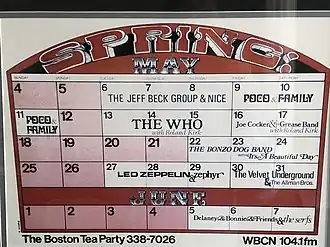![]() The May 1969 concert schedule for the venue, displaying acts such as Led Zeppelin, the Velvet Underground and the Who | |