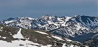 Bowen Mountain is the seventh-highest peak of the Never Summer Mountains which are a subrange of the Rocky Mountains.[4] The mountain is set in the Never Summer Wilderness on land managed by Arapaho National Forest. It is situated along the Continental Divide with the summit offset by approximately one-half mile. Precipitation runoff from the mountain's slopes drains chiefly into the Colorado River. Topographic relief is significant as the summit rises 3,700 feet (1,100 meters) above the Kawuneeche Valley in four miles (6.4 km) and 2,100 feet (640 meters) above Bowen Gulch in one mile (1.6 km).