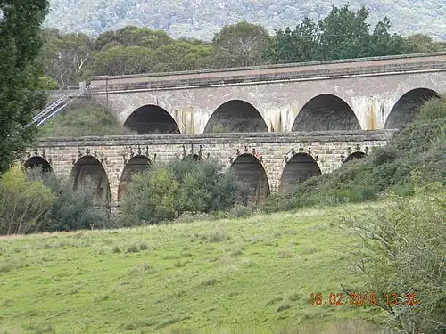 A sandstone viaduct built for the original single track Great Western Railway over Farmers Creek west of Bowenfels Railway Station. There are nine semi-circular arches 1 metre (2 ft) thick. The piers are solid stone, founded at shallow depth into rock. At the piers, the internal "V" formed by the adjoining arches is filled by stone rubble to about 5 metres (15 ft) and dished to form a drain. By this arrangement the ballasted tracks are drained and do not get water logged. There is a low stone parapet wall on each side of the viaduct. The abutments are solid stonework.[1]