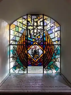 Window in St Botolph-without-Bishopsgate church donated by the Worshipful Company of Bowyers, showing their coat of arms