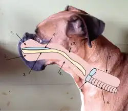 1. Nasal cavity 2. Oral cavity 3. Soft palate 4. Pharynx 5. Larynx 6. Trachea 7. Esophagus 8. Nasopharynx 9. Hard palate