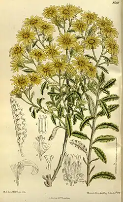 Brachyglottis monroi (Monro's ragwort;[1] syn. Senecio monroi) is a species of plant in the family Asteraceae, formerly classified in the genus Senecio. Native to New Zealand and Tasmania, it is a small, hardy, evergreen shrub growing to 1 m (3 ft 3 in) with crinkly-edged, olive green, leathery leaves and yellow daisy-like flowers in terminal corymbs in summer.[2][3][4]