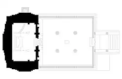 The spire, mandapa (dome) and doorway must have been destroyed which are rebuilt later in bricks and mortar.[6] It is built of white sandstone and cement-covered bricks. It is 57 feet long, 30 feet broad, and 36 feet high.[7] The sanctum is 32 feet wide which is navaratha in anga and hastangula in plan and is of fully decorated class. Its pitha (base), the vedibandha and the mandovara (middle part of the wall) is resemble to the temple at Sunak.[3] The lower part of main shrine is intact and is filled with images of gods, goddesses and apsaras.[6][1] These images in jangha portion are poorly retouched. The chauri-bearers on nandika are elegantly carved which are common in 11th century temples. The phansana roof resembles Vimala Vasahi temple and is crowned with a ghanta.[3] There are images of Brahma in the niches on the three sides.[6][1] The modern mandapa hall has four pillars reused from the original mandapa. They are octagonal and has carvings of bells and chains with band of kirtimukha faces on the top. The doorway can be original or the modern one. It has floral patterns and minor sculptures. The dedicatory block in the centre has Ganesha.[1]