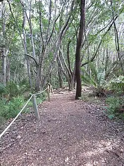 A Braille trail is a walking path or hiking trail that is designed to be accessible by those who are visually impaired. In particular, trails are often delineated with ropes or other physical barriers, and signage and other markers have audio or are written in Braille.[1]