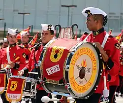 In the Independence Day parade of 7 September 1946, the then Drum, Fife and Bugle Corps had just been reorganized in the manner of the United States Marine Drum and Bugle Corps, in response to and in honor of the Brazilian participation in the Second World War as a 123-strong field music formation, during that parade it was then made up of the Corps Bandmaster, the deputy bandmaster, the drum major, 8 bass drums, 8 single tenor drums, 8 cymbals, 8 snare drums, 16 field snare drums, 16 fifes, 24 1st bugles, 24 2nd bugles and 16 tenor bugles. In 1951, it became the Pipes, Drum and Bugle Corps when 16 Great Highland bagpipes, a gift to the Corps by bagpipers of the British Armed Forces, arrived in Brazil and was given to the Corps by the crew of the USS St. Louis (CL-49), which under the name Almirante Tamandaré, was commissioned as the flagship of the Navy. Another relic of the past lies in its Turkish crescent, a symbol and instrument of European origin used in the old bands of the Army and Navy in the 19th century. The following year, the BMPDC was deployed to the United Kingdom to celebrate the Coronation of Elizabeth II and the bagpipers played for the first time, after receiving bagpipe training in the Army School of Bagpipe Music and Highland Drumming based in Edinburgh by British Army instructors. The Corps had also performed on behalf of the Navy in France, Paraguay and Portugal, in the 2005 Bastille Day military parade and in the 2011 Royal Edinburgh Military Tattoo.[2] In 1956, the drum corps appeared on film for the first time when it performed in the movie Fuzileiro do Amor.[3]
