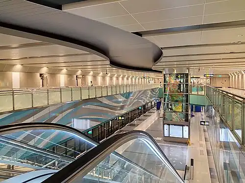 The station roof over the platform level has a wave-like pattern that references the nearby Kallang River. The gaps in the ceiling are intended to reflect crown shyness, a natural phenomenon in which the crowns of the trees avoid touching each other.[34] An Art-in-Transit artwork, A Kaleidoscopic Nature by Angie Seah, is displayed on the station's lift shaft.[35] Depicting colours and patterns derived from plants at the nearby park, the work was created using gouache, watercolour, acrylic paints, inks and markers.[34]