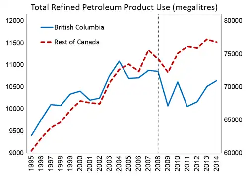 Although fossil fuel consumption initially dropped rapidly, the Great Recession also led to lower consumption globally. A report in 2015 suggested an 8.5% reduction to date in greenhouse gas emissions, which may also be affected by cross border purchases of vehicle fuel.[27] Stats Canada reports that between 2007 and 2018 fuel consumption of gasoline in British Columbia has increased by 5.2%, while consumption in Canada as a whole increased 9.8%, suggesting the possibility that British Columbia's fuel consumption rose less than the rest of Canada's due to behavioral changes stemming from the tax, as the policy intended.[28]