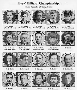 There were previous championships for young players. A 1905 article in the Darlington-based newspaper The North Star said that "boy billiard matches appear to be good drawing concerns now" and noted that there was an upcoming round-robin tournament at Burroughes and Watts, London.[3] Tom Newman recalled in a 1938 interview in The Billiard Player, that he won a Boys Championship in 1909 at the age of 15 at Burroughes and Watts.[4]