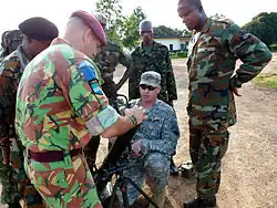 The mission, codenamed Operation Barras, was undertaken by D Squadron of 22 Special Air Service Regiment, who assaulted the village of Gberi Bana to extract the soldiers, while a company group formed around A Company, 1 PARA, assaulted Magbeni, on the opposite side of Rokel Creek. The operation was successful and all the British captives were extracted, along with their SLA liaison and 22 Sierra Leonean civilians, while the WSB were defeated as a military force.[83] A British soldier and at least 25 West Side Boys were killed in the operation.[83][84] Many other West Side Boys fled and later surrendered to Jordanian peacekeepers. The Jordanians had received 30 by the end of the day, and 371—including 57 children—had surrendered within a fortnight. Some of those who surrendered went on to volunteer for the new Sierra Leone Army, and those who were accepted went into the British-run training programme at Benguema.[85] Following Operation Barras, two SLA battalions—graduates of the British short-term training programme—swept the area surrounding the West Side Boys' camp to clear it of any remaining gang members.[86]