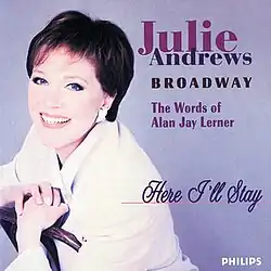 Here I'll Stay (official title including subtitle: Broadway: Here I'll Stay — The Words of Alan Jay Lerner) is the tenth studio album by English singer Julie Andrews. It was released in 1996 by Philips Records. The album was the second and final installment in Julie Andrews' Broadway-themed series, following Broadway: The Music of Richard Rodgers. Focused on Alan Jay Lerner's compositions, it features full suites from Brigadoon, Paint Your Wagon, My Fair Lady, and Camelot, with arrangements by Ian Fraser.