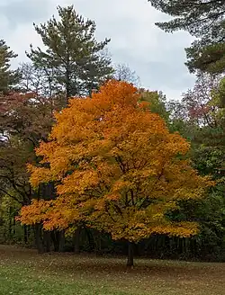 The most important tree in the park is the American yellowwood (Cladrastis kentukea, formerly known as Cladrastis lutea). This tree typically does not grow further north than central Kentucky, and has been designated as a state threatened species in Indiana.[21] Other trees found in the park include at least four types of oak (black, chestnut, red, and white) and three types of hickory (bitternut, pignut, and shagbark). The park also contains at least two types of maple trees: black, sugar, red and silver. Patches of paw paw trees can be found throughout the park, and these trees produce an edible fruit. In areas with good moist soil, the black walnut tree grows. Among other trees growing in the park are the American beech, basswood, black cherry, black gum, and red elm. Also the sassafras, sycamore, white ash. The park also contains at least eight kinds of ferns and 20 types of wildflowers, including bloodroot and wild geranium.[21]