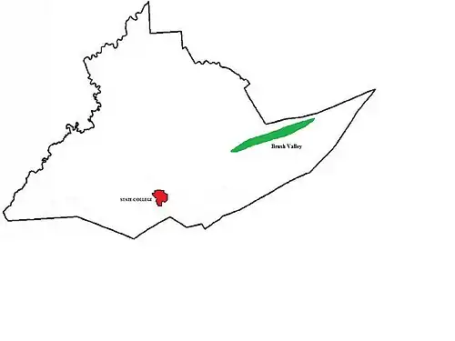 Brush Valley is a southwest to northeast narrow valley of the Ridge-and Valley Province of the Appalachian Mountains in central Pennsylvania. The valley is bordered by Nittany Mountain to the north and Brush Mountain to the south in Gregg and Miles Townships in eastern Centre County. The main route of travel through the valley is PA Route 192 which starts at Centre Hall and travels the entirety of the valley before the valley ends near the village of Livonia in the Bald Eagle State Forest near R.B. Winter State Park.[1] The valley is a little over 16 mi (26 km) in length and averages around 1 mi (1.6 km) in width. At its widest point it reaches only around 1.5 mi (2.4 km).