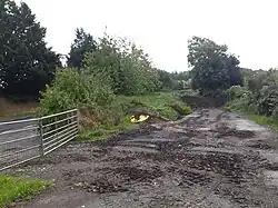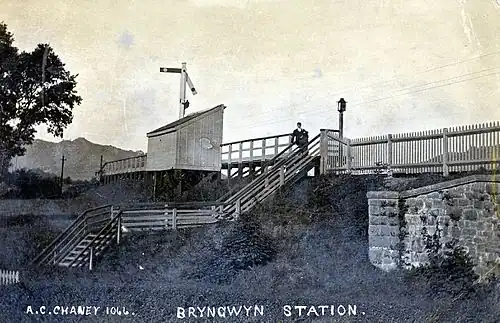 The Llanfyllin Branch of the Cambrian Railways opened on 17 July 1863.[1] The station was originally named Brongwyn; it was later renamed Bryngwyn.[2] It was 6+34 miles (10.9 km) from Llanymynech, and took its name from Bryngwyn Hall.[1] In 1866, there was one train on Tuesdays and one on Wednesdays.[1] Originally provided with a wooden shelter, this was later replaced by one of corrugated iron.[1] The platform was situated on an embankment on the west side of the Llanfechain road over bridge with step access to the road.